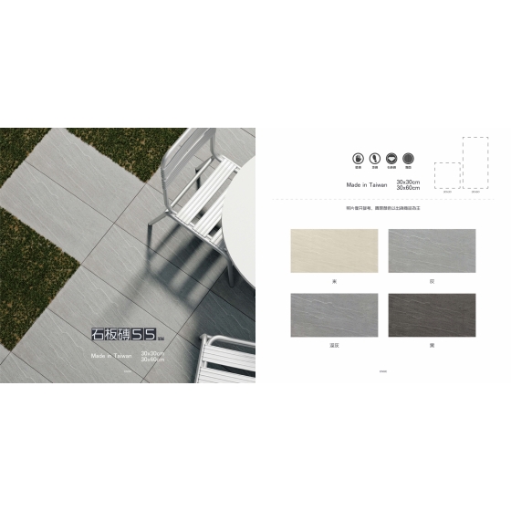 運用「石英磚材質」吸水率低,高抗折經久耐用。 使用「歐洲釉料塗層」抗污易清潔。 利用「2種規格」可做地、壁延伸組合設計施工。 ----------------------------------------------------------------