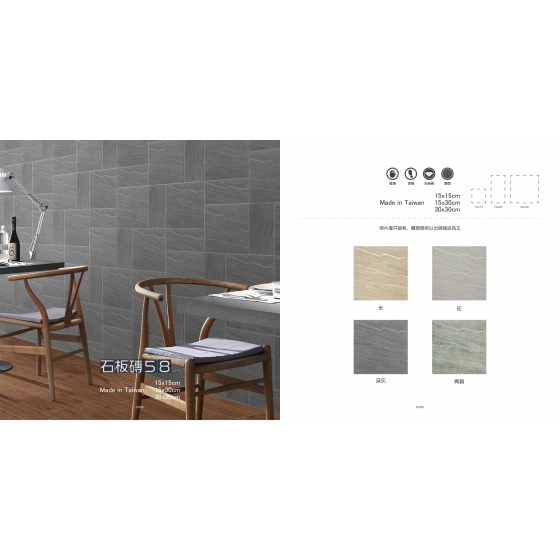 運用「石英磚材質」吸水率低,高抗折經久耐用。 使用「歐洲釉料」色澤自然變化。 採用「數位噴墨印刷」層次立體。 利用「3種規格與多模樣」滿足多元組合設計。 ----------------------------------------------------------------