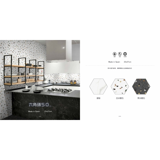 活潑可愛的彩色水石子六角磚, 優雅高貴的銀狐六角磚, 兩種不同紋路,展現兩種風格, 呈現出不同的生活儀式。