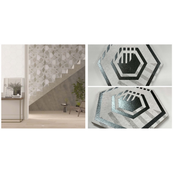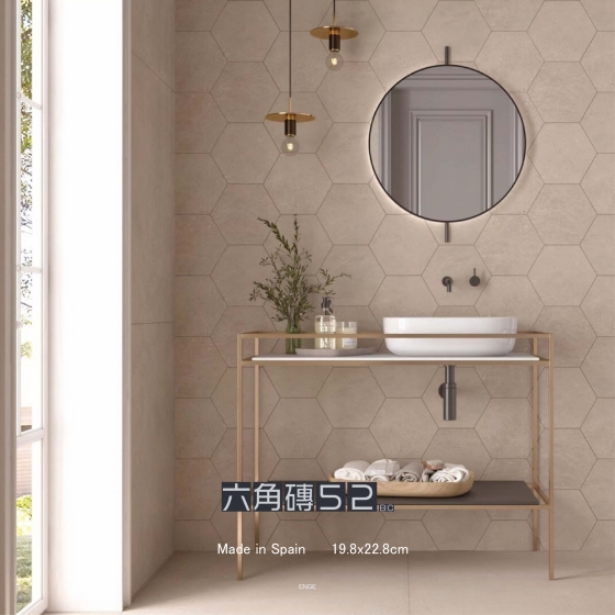 石材內斂沉穩的色調, 真實石材觸感的紋路, 有個性的幾何花紋, 利用特殊的「止滑閃釉」塗料, 讓磁磚隨著光線變化與您的角度不同, 反射出不同光澤感, 讓您一塊磁磚擁有多種體驗。
