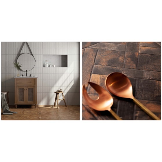 優雅舒適的木紋色調, 真實且自然的紋路, 交錯拼貼的效果, 展現獨特的優雅氣質, 打造您的特別空間。