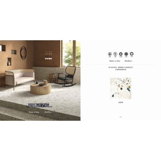 復刻了早期那經典的水磨石, 以1960年義大利傳統手工為起點, 透過大理石、玻璃以及石英碎片, 透出真實的純粹質感, 穿越時空以全新的樣貌展現在您眼前。