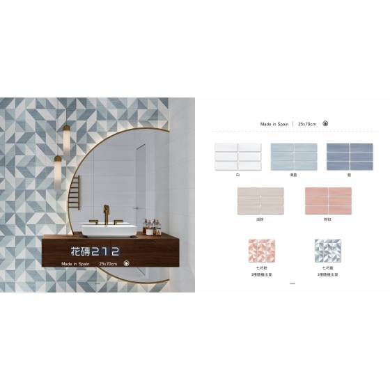同時也製作出5種素磚12種模面,不只可以單貼還可以搭配花磚,