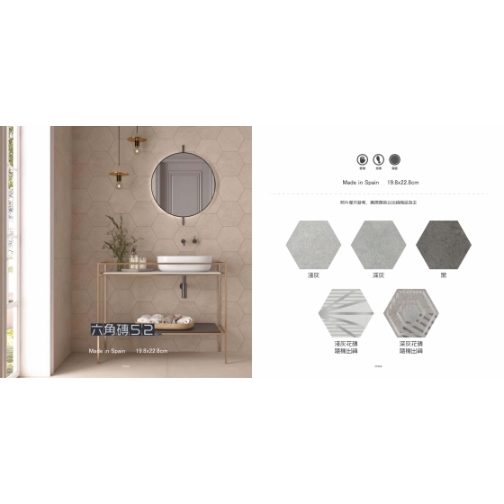 石材內斂沉穩的色調, 真實石材觸感的紋路, 有個性的幾何花紋, 利用特殊的「止滑閃釉」塗料, 讓磁磚隨著光線變化與您的角度不同, 反射出不同光澤感, 讓您一塊磁磚擁有多種體驗。