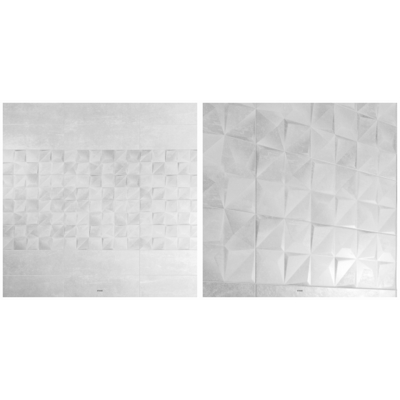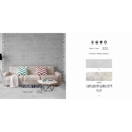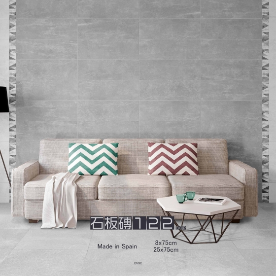 舒適穩重的淺灰色調, 優雅氣質的立體紋路花磚, 搭配上腰帶黑與白交織的幾何圖, 讓空間顯得格外現代簡約時尚感。