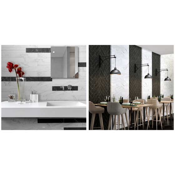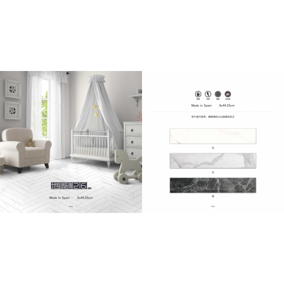 經典的黑灰白色調,優雅的銀狐紋路, 多種拼貼方法展現不同視覺效果, 三種深淺色調互相搭配, 將空間視覺層次更提升一階。